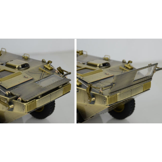 模型采用纯金属制造,1:28比例,长35厘米,履带、炮塔、舱门、前后装甲板等都可以灵活打开活动。