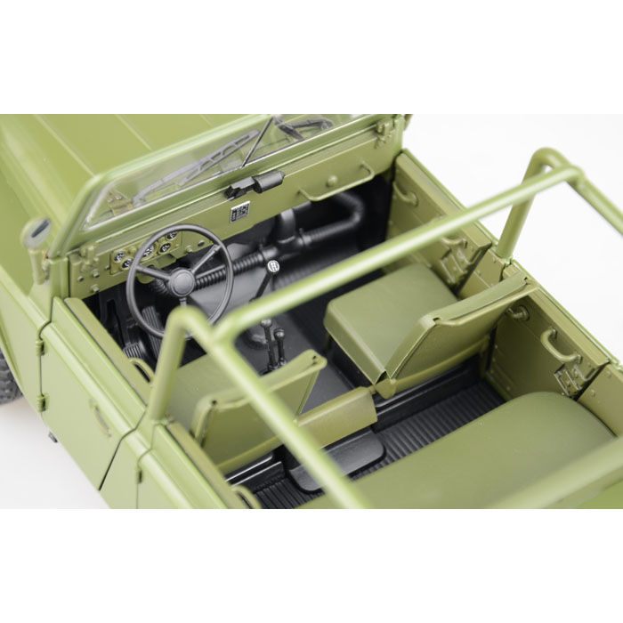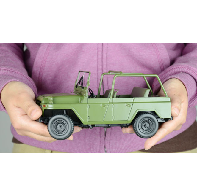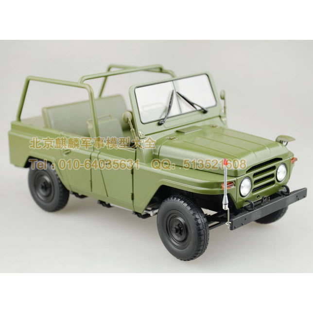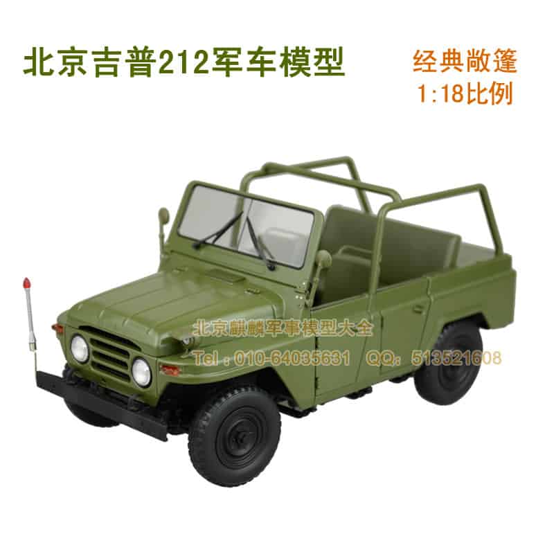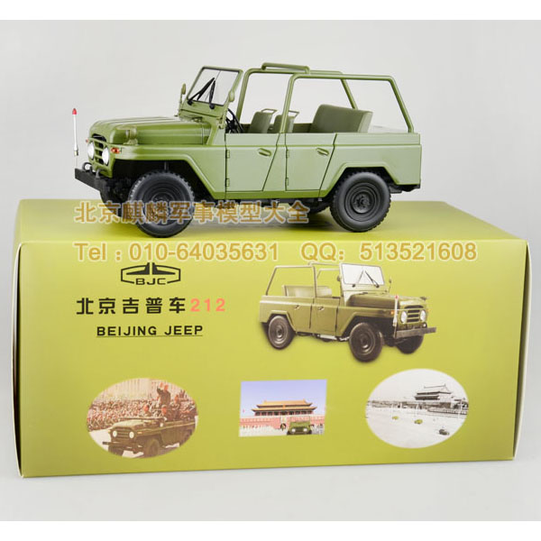 BJ212吉普:是中国的第一部国产吉普车。1965年,由北京汽车制造厂自行设计制造,1966年投入生产。该车借鉴苏联嘎斯69技术,参考美国吉普外观,融入中国元素,采用软顶可拆、高底盘和四轮驱动设计,坚固耐用,价格低廉,维修简便,越野性能良好。在1966年“文化大革命”期间,新中国第一代领导人毛泽东主席身穿绿军装乘此车检阅了来至全国各地的百万红卫兵。之后,又在1969年中苏反击战和1979年中越反击战中,发挥了重要作用。60至80年代,身穿“绿军装”的 BJ212吉普作为时尚用车和身份的象征风靡全国,是部队和各级政府的主流公务车,成为国人的骄傲,影响了整整一代人。20世纪末,备受青睐的BJ212吉普车市场保有量达60万辆,累计产量雄居全国第一。即是在汽车销售普遍低迷的90年代, 其销售量仍独占鳌头,创造了30多年畅销不衰的神话。 BJ212吉普车突显了那个时代的特征,是中国吉普车发展的重要标志。该车模真实的再现了历史,由合金仿真制作,比例为1:18,有二百二十多个精致的零部件组成。整车工艺精湛,结构缜密,车内装饰精巧,质地考究细腻,车灯、车门、发动机、底盘等细节完美逼真,军绿色喷漆一流,做工精细。车模制作有六种不同款式,限量生产10000台,每台车模一个收藏编号。面向国内外发行,堪称经典之作,具有极高的收藏价值。