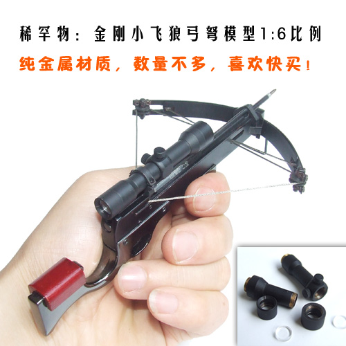 金刚小飞狼弓弩模型是根据原弩的尺寸缩小至六分之一(1:6)精制而成,虽然非常小,仅仅只有12厘米长,但它具有和真弩一样的功能,可以发射,不过发射的不是箭,而是圆珠笔芯。如果在家里的墙上挂一个纸板子,没事玩一玩发射圆珠笔芯,要比扎飞镖好玩多了。