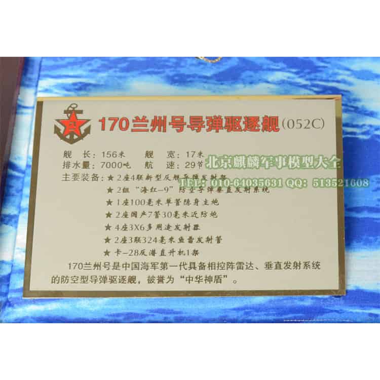 中国军舰 之 导弹驱逐舰模型有多个型号,比例有:1:200(大)和1:350(小)两种规格,模型材质采用金属和树脂的合成,做工相当细致,模仿的惟妙惟肖,普遍适用于:观赏、装饰、送礼、教学等。